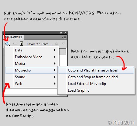 Untuk gunakan Behavior, buka panel Behavior (Shift+F3) dan klik pada icon ‘+’ untuk memasukkan actionScript.